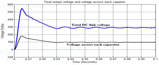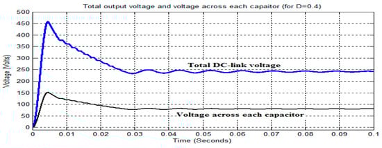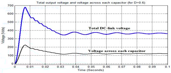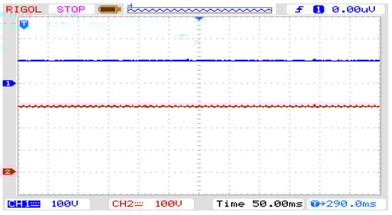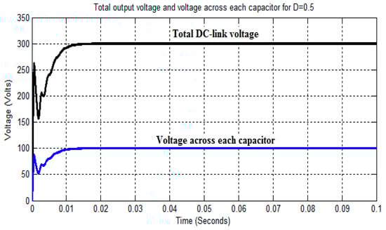 Referring to Figure 26, the TLBC output voltage across each capacitor and the total DC-link voltage are shown in Channel 1 (CH1) and Channel (CH2), respectively, for D = 0.5. It is observed that CH1 and CH2 voltages are boosted to 100 V and 300 V, respectively.