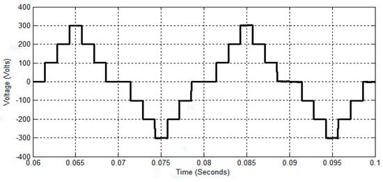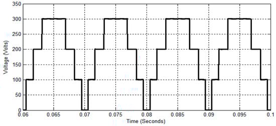 Figure 16 shows the output voltage across the LGU in the DCLCHB inverter. Referring to Figure 16, the LGU generates a unipolar stepped waveform, and it can be converted to a bipolar stepped wave using PSGU. Figure 17 and Figure 18 show the seven-level stepped output phase voltage and its THD analysis of the TLBDCLCHB inverter using the EPCAD technique for the duty cycle of 0.5. It is observed that the magnitude of the fundamental output phase voltage and its RMS value is 229.9 V and 162.5 V, respectively. Also, the THD of the proposed TLBDCLCHB inverter output using the EPCAD technique is 30.08%.