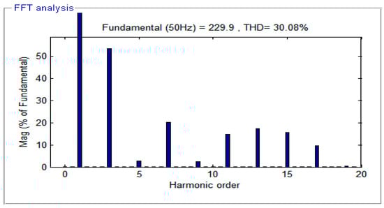Figure 30 and Figure 31 represent the TLBDCLCHB inverter system experimental output phase voltage and its harmonic spectrum using the EPCAD technique for the generation of a seven-level stepped output voltage. Referring to Figure 30 and Figure 31, it is observed that the RMS value of the output phase voltage is 161.7 V and its THD is 31.5%.