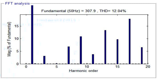 Figure 32 and Figure 33 represent the TLBDCLCHB inverter system experimental output phase voltage and its harmonic spectrum using the SPWCAD technique for the generation of a seven-level stepped output voltage. Referring to Figure 32 and Figure 33, it is observed that the RMS value of the output phase voltage is 216 V and its THD is 11.5%.