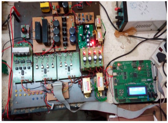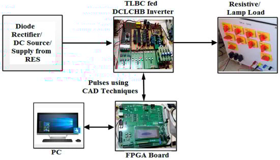 The model of the proposed TLBDCLCHB inverter system-fed R-load is implemented employing Xilinx Spartan FPGA-based pulse generation [19,20] to validate the Simulink results. The block diagram, Xilinx Spartan6 development board, and the prototype model of the TLBDCLCHB inverter system using an FPGA is shown in Figure 22, Figure 23 and Figure 24, respectively. It consists of TLBC, the DCLCHB inverter, a personal computer (PC), an FPGA controller, R-load, buffer circuit, optocoupler, and driver circuit. The output of TLBC-fed DCLCHB inverter using an FPGA controller is shown in Figure 25.