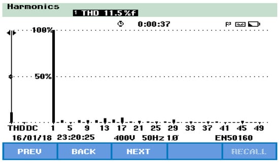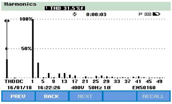 In this study, theoretical and simulation results of the proposed TLBDCLCHB inverter system for the generation of a seven-level stepped output phase voltage using the EPCAD and SPWCAD techniques have been validated experimentally through an FPGA-based pulse generation. Table 7 and Table 8 analyze the output phase voltage (Vrms) and THD of the TLBDCLCHB inverter system for different duty cycles, i.e., D = 0.4, 0.5, and 0.6. The THD of the prototype model for the proposed CAD techniques are conceded using a Fluke 435 power quality analyzer, and the results are presented in Figure 16, Figure 17, Figure 18, Figure 19, Figure 20, Figure 21, Figure 22, Figure 23, Figure 24, Figure 25, Figure 26, Figure 27, Figure 28 and Figure 29 for the EPCAD and SPWCAD techniques.