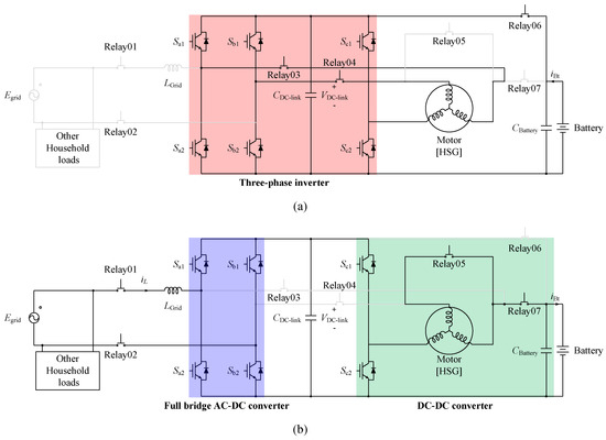 Figure 2a,b show the circuit configuration for different operating modes according to the switching state of the relays. As shown in Figure 2a, the circuit for the HSG drive mode is composed of a battery, a three-phase inverter, and an HSG. When Relay 06 is turned on, the electric energy of the battery is supplied to the three-phase inverter. In this mode, six semiconductors are utilized to configure the conventional three-phase two-level inverter. The DC voltage and current of the battery are converted into AC voltage and current using the three-phase inverter. Relays 03 and 04 are turned on to supply the three-phase AC current to the HSG.