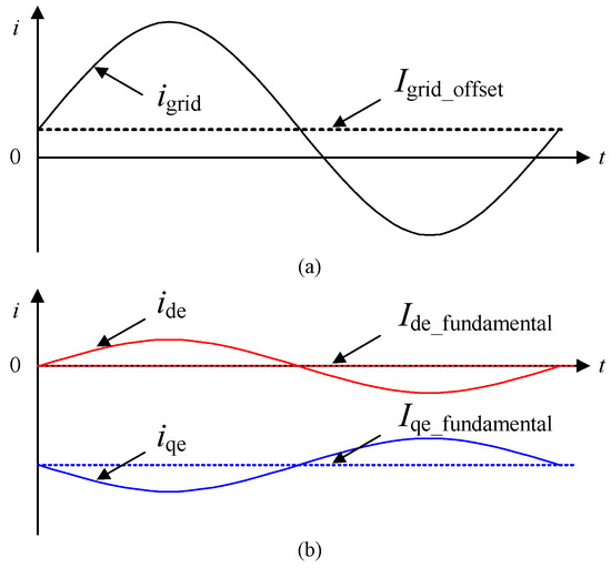 Waveform of current with DC offset: (a) Grid current and (b) d–q axis current contained in the DC offset.