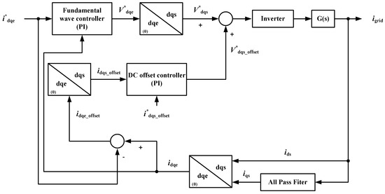 Figure 6 shows a block diagram including the DC offset controller and the fundamental wave controller. As shown in the block diagram, each controller is composed of a PI controller. The grid current containing DC offset igrid is converted into variable idqe in the rotating coordinate frame using the APF and a coordinate transformation. Comparing the value between the reference current i*dqe and real current on the d–q axis, idqe is utilized as the input of the fundamental wave controller. The controller generates the reference voltage v*dqe to operate the OBC. The reference voltage for the rotating reference frame v*dqe is converted for the stationary reference frame to be used as the input of the inverter.