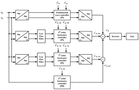 In Equations (16) and (17), only the DC components are extracted from each current component expressed in the d–q axis coordinate frame using the LPF. The filtered value and the harmonic reference current are used as inputs of each order harmonic controller. Consequently, the output of the controller is added to the fundamental reference voltage after an inverse coordinate transform, reducing the lower-order harmonics in the grid current.