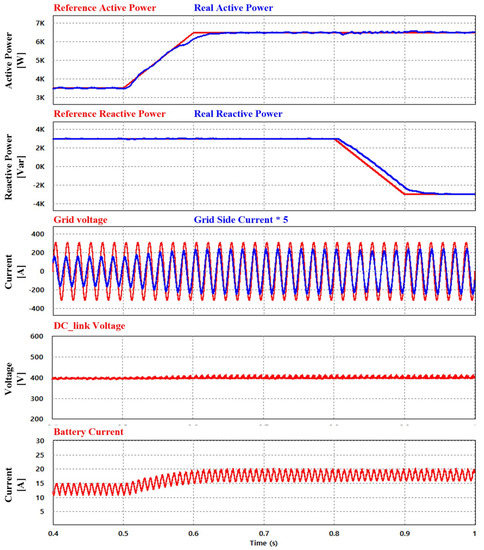 However, the reactive power is generated at approximately −3 kVAR, and the PF changes from a leading to a lagging factor. Apart from the fluctuation of the active and reactive powers, the DC-link voltage maintains a constant value depending on the reference of the DC–DC side voltage controller, except for the second-order ripple. A battery current only fluctuates when the referenced active power is changed. As the referenced active power is increased, the battery current increases along with the grid side current. Thus, the fluctuation of the referenced active power influences not only the magnitude of the grid side current but also the magnitude of the battery current.