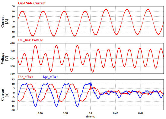 Figure 9 shows the simulation results of the DC offset compensation method. Before the proposed method is applied, a DC offset of approximately 8 A occurs in the grid current. The ripple of the DC-link voltage varies from approximately 364.1 to 434.9 V. Moreover, the offset currents in the rotational coordinate frame d–q axis vary from approximately 10 to −15 A. After the proposed method is applied at 0.4 s, it is possible to observe that the DC offset is eliminated in the grid current. Moreover, the ripple of the DC-link voltage is decreased by approximately 10 V, and, thus, the variation in the DC-link voltage is from 374.9 to 425.3 V. In addition, the variation in the offset currents in the rotational coordinate frame d–q axis is approximately 2 to −6 A.