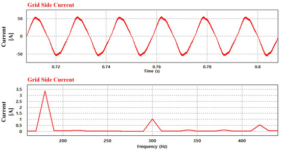 Figure 11 shows the simulation results when applying the lower-order harmonics compensation method. Compared with the case in which the controller is not operated, it is possible to observe that the waveform of the grid side current is improved. The THD of the current is improved by up to 3.63%. Moreover, it is possible to confirm that the lower-order current harmonics are significantly reduced based on the FFT analysis results.