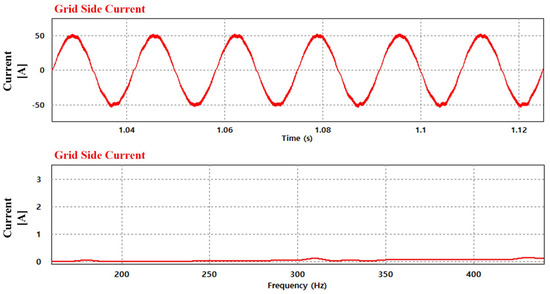 Figure 10 shows the simulation results without the lower-order harmonics compensation method. If the proposed method is not applied, the THD of the grid current is approximately 8.14%, which is not suitable for the limits of the THD specified by IEC61000, the international standard for an input current. Moreover, the fast Fourier transform (FFT) analysis results indicate that the grid current includes lower-order current harmonics.