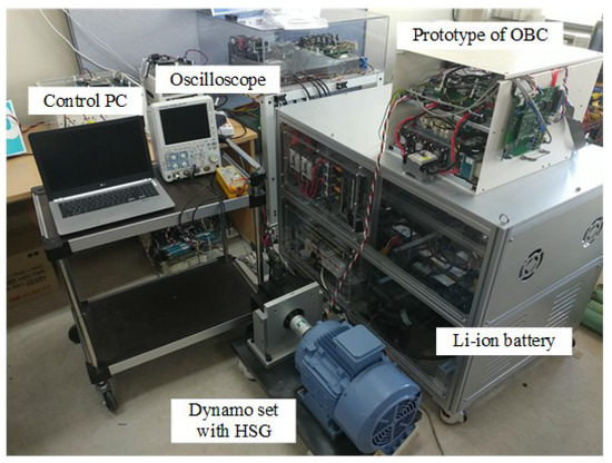 Figure 12 shows the practical experimental set construction. The prototype bidirectional OBC consists of a relay board, and control board, etc. The control board consists of a digital signal processor (DSP) TMS320F28335 and other peripherals. Among the motor/generator set, we only use the winding of the HSG operating as a filter inductor of the DC–DC converter. The parameters of the experiment are the same as those of the simulation, as indicated in Table 4.