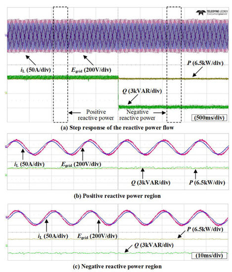 Figure 13 shows the experimental results of the active and reactive power flow control method. The DC-link voltage is controlled at 400 V, similar to the simulation. As shown in Figure 13a, the reactive power controller produces fast response following the step change of its command. When the reactive power output is 3 kVAR, the grid current shows a leading PF compared with the grid voltage, as shown in Figure 13b. The PF of the grid side current is 0.432, i.e., leading, because the active power is controlled at approximately 6.5 kW. As shown in Figure 13c, the reactive power controller generates −3 kVAR of reactive power. In this case, the PF is 0.432, i.e., lagging, with the active power, which is controlled at 6.5 kW.