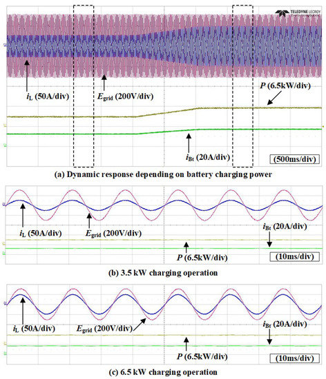 Figure 14 shows the experimental waveforms of the grid side and battery current depending on the increasing of the active power. In this experiment, the active power varies from 3.5 to 6.5 kW as shown in Figure 14a. In contrast, the reactive power is controlled as 0 kVAR. When the controlled active power is 3.5 kW, the magnitude of the grid current is about 35.6 A and the average value of the battery current is approximately 13.2 A as shown in Figure 14b. When the active power is changed to 6.5 kW, the grid side and battery current are increased, as shown in Figure 14c. In this case, the magnitude of the grid current is about 49.5 A and the average value of the battery current is approximately 18.0 A. Because the reactive power is controlled at 0 kVAR, the grid side current shows the unit PF.