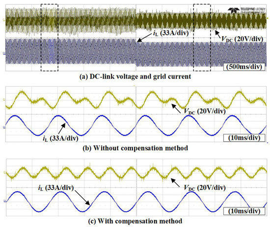 Figure 15 shows the experimental results of the DC offset compensation method. In order to confirm the performance of the compensation method clearly, the DC offset current is injected intentionally as shown in the left side of Figure 15a. Since the grid current includes severe DC offset component, which is approximately 6A, the DC-link voltage is fluctuated from 377 to 423 V. In addition, the fluctuation of the DC-link voltage causes the distortion of the grid current as shown in Figure 15b. The proposed compensation method is applied at the middle of the time scale and the DC offset component in the grid current is eliminated as shown in Figure 15c. In addition, the fluctuation of the DC-link voltage is reduced from 382 to 418 V and the grid current is produced as sinusoidal waveform.