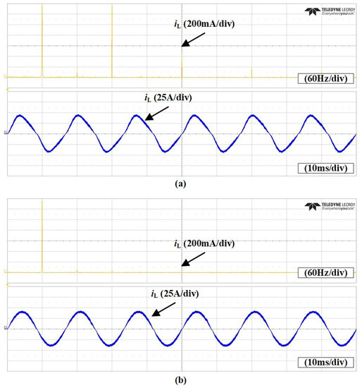 Figure 16 shows the experimental results of the lower-order harmonics compensation method. As shown in Figure 16a, the FFT analysis result shows that the grid current contains lower-order harmonics current especially 3rd, 5th, and 7th harmonics. Therefore, the grid side current waveform is distorted by the harmonics. When the proposed compensation method is applied, the FFT analysis result shows that the harmonic currents are eliminated as shown in Figure 16b. In addition, the quality of the grid current is improved by eliminating the harmonic components.