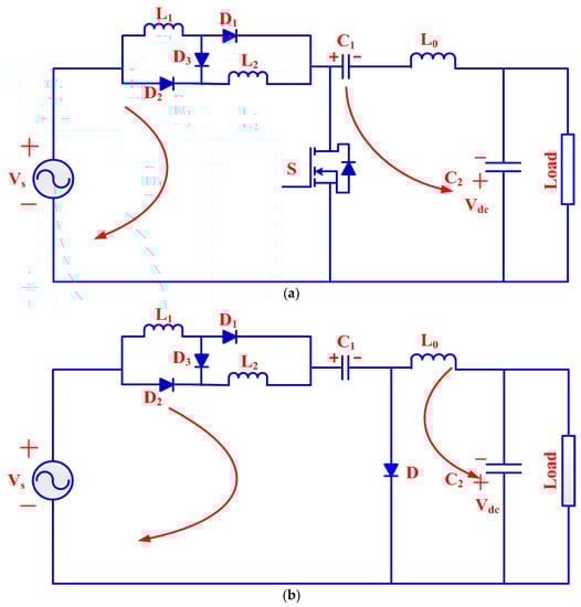 The integrated Cuk converter operates in various modes of Continuous Conduction Mode and discontinuous conduction mode. DICM (Discontinuous Inductor Current Mode) and Discontinuous Capacitor Voltage Mode (DCVM) are treated as two modes of discontinuous conduction mode operation. The Cuk converter execution [26] in CCM is described as following intervals. In the first interval, when switch S is turned , the switched L1 and L2 store energy while C1 discharges energy, which is shown in Figure 2a. In the second interval, the S is turned , the switched inductor is responsible for energy storing, and C1 gets discharged using switch (S) which relocates DC link capacitor (C2) depicted with Figure 2b.