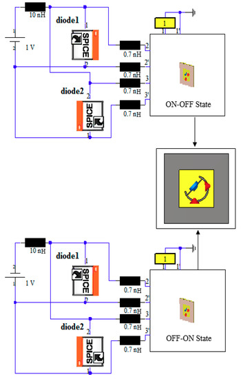 For the prototype implementation of the PIN diodes, practical switches (SMP1320 series) manufactured by Skyworks Solutions (Woburn, MA, USA), size 1.55 × 0.75 mm2, were used as the switches, as shown in Figure 3. The “ON” and “OFF” states for the PIN diode equivalent circuit are given in Figure 4.