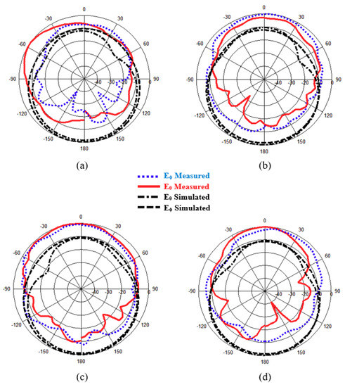 Figure 7 shows the measured and simulated radiation patterns of the proposed structure for both configurations (RHCP and LHCP) at resonance frequencies. Full wave simulation was carried out using CST software (ver. 2017, CST, Framingham, MA, USA) and the measurement radiation pattern was observed inside an anechoic chamber. Eϕ represents the co-polarization properties and Eθ denotes the cross-polarization properties. The E and H planes are represented by the yz and xz coordinates, respectively. These results were simulated and measured at the resonance frequency of 3.4 GHz.