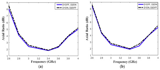 From these results, the axial ratio can be observed and measured as shown in Figure 8. At resonance, a value for the axial ration of 2 dB or less results if the difference between the cross-polarization component and the co-polarization component is 2 dB or less. From the measured and simulated results, circular polarization was observed in each switching state, and in the E and H planes. The results demonstrate circular polarization at broadside and in the most important directions for both the xz-plane and the yz-plane.