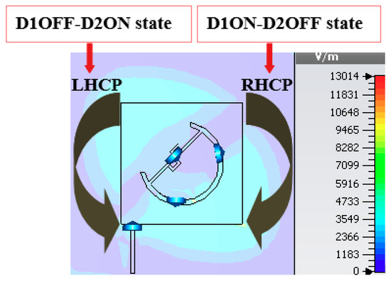 Figure 9 shows the captured view of the animated field explaining the sense of rotation of circular polarization for the antenna. It is clear that the field is rotating in the right-hand sense in the D1ON-D2OFF state, and rotating in the left-hand sense in the D1OFF-D2ON state.