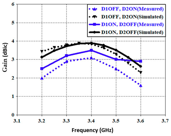 Figure 10 shows the simulated and measured gain, i.e., a maximum of 3.8 dBic for simulated gain in both switching states for the diodes, and measured gain of 3.1 to 3.5 dBic. The discrepancy between the simulated and measured results was attributable to the tolerances of the FR-4 substrate and other factors, such as etching precision, soldering, biasing circuits, and copper thickness.