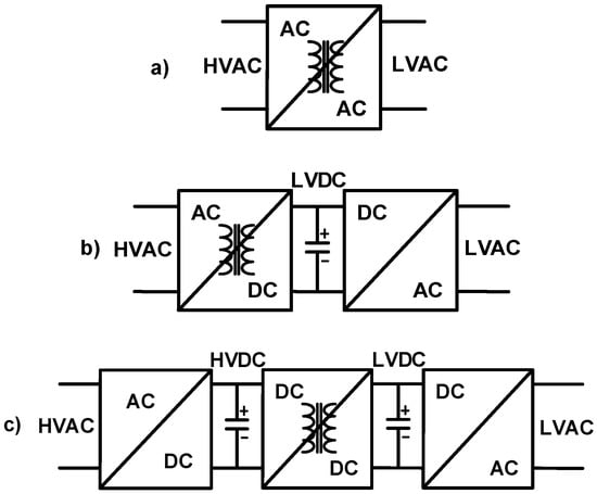 Solid state transformer (SST) topologies: (a) single stage, (b) two stages, and (c) three stages.