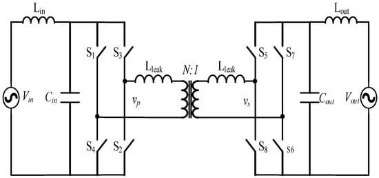 Two stage conversion is also possible as reported in [21,22,23,24] as shown in Figure 1b. The absence of bulky capacitors in [21,22] resulted in increased power density and improved reliability. Although active rectifier was used in this topology, the control strategy was not effective in shaping the incoming current into a sinusoidal waveform. In addition, the used matrix converter requires a large number of switching devices and a complex switching scheme to achieve soft (low loss) switching [19,25]. Moreover, matrix converters have high semiconductor chip area due to the large number of active semiconductor devices [26]. Both [21,22] realize flexible power conversion and power factor correction. However, the topology presented in [22] was not able to facilitate frequency independence between the high-voltage (HV) and the low-voltage (LV) signals.