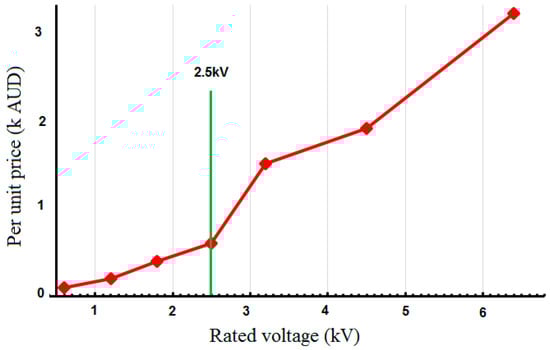 Adopting multi-level topologies to increase power rating, and equivalent switching frequency instead of using high power expensive switching devices may be more cost-efficient because below the 2.5 kV threshold the price of insulated gate bipolar transistors (IGBTs) drops drastically as shown in Figure 3 [49]. For example, in order to build an 11 kV SST using a modular topology, at least seven levels are required, as each will be supporting a DC link of 2.7 kV. The highest rating of the commercially available IGBT, which is 6.5 kV, can be used to create the 11 kV SST. Otherwise, if increased to 21 levels, the cost-effective 1.7 kV IGBT can be employed [49].