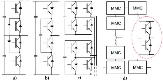 Multi-level topologies: (a) Three-level neutral point clamped; (b) Three-level flying capacitor converter; (c) Cascaded H-bridge converter; (d) Modular multilevel converter [58].