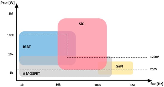 Gallium Nitride (GaN)-based power transistors are also a promising alternative to silicon-based IGBTs for applications that require fast efficient switching for up to 10 MHz [61]. Currently, breakdown voltages are limited to 1000 V. Therefore, GaN-based power transistors can be considered for SSTs serving high-end applications at a small voltage conversion range such as the tactical mobile microgrid power systems [62]. Meanwhile, SiC would be the most suitable choice for high voltage SSTs switching in the kHz frequency range. Figure 5 shows the voltage vs. frequency ratings of Si, SiC, and GaN devices.
