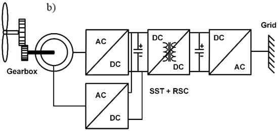 Another solution suggested to reduce the size of the step-up transformer is the adoption of a transformerless MMC converter [74,75,76] that would integrate the generator to the grid and step up the voltage without the need for a step-up transformer. However, this approach requires special modular generators or multiple traditional generators to generate isolated multiple dc supplies for the MMC converter. Furthermore, it does not provide the galvanic isolation between the generator and the grid. Thus, a high-frequency link (i.e., SST) would be a more suitable solution [49].