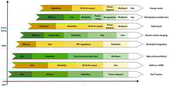 The commercialisation of SSTs will be driven by a set of market drivers that will encourage or restrain the demand. These market drivers are defined according to preferred features of SSTs for different applications. Figure 9 shows different market drivers for different applications on a timeline. These market drivers shall govern the development of SSTs from proof of concept to commercialisation. For instance, size reduction is crucial for wind applications, but having a DC connection is not. On the other hand, for the railway traction drive mentioned in [23], unidirectional power flow is enough [91]. While transformers serving a hybrid AC/DC grid require a multiport SST allowing power exchange between a number of branches. In military and high-end applications, the cost is not the underlining value and reliability is at most importance. For distribution transformers, size reduction will not be pushed to its limits, as it may compromise reliability because of extensive heat management requirements.