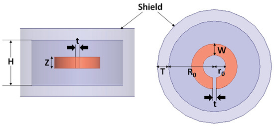The resonant frequency and Q-factor of SRR are dependent upon critical dimensions besides material and other properties. Important material properties which affect the values of these parameters include bulk conductivity, relative permeability and mass density of both the split-ring and shield material [9]. Important properties of the shield materials are given in Table 1 [9]. As per guidance available in earlier research [1,10,11], high conductivity is a necessity for a split-ring, so copper has been utilized in this work to design the split-ring. The shield has been designed using aluminum (AL), brass (BR) [21], stainless steel (SS), cast iron (CI), and tin (SN). These have been previously utilized in an earlier work [9].