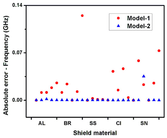 Absolute errors for frequency pertaining to shields of different materials.