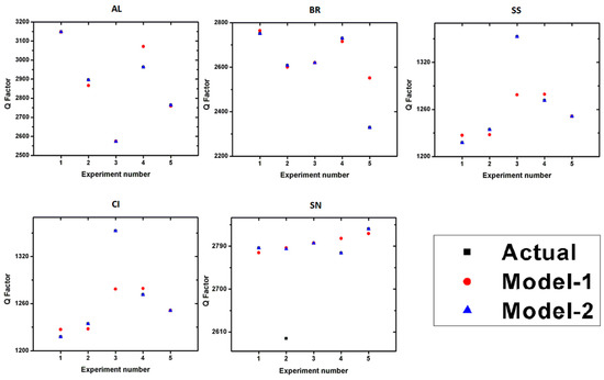 Interactive regression equations for resonant frequency and Q-factor were formulated in a similar manner. Coefficients were generated by the iterative routine for Model-2. These equations describe not only the dependencies of these parameters over geometrical dimensions of the shield but also the effect due to their interactions. Regression equations for resonant frequency and Q-factor pertaining to SRRs of different shield materials were obtained. Generalized forms of equations for resonant frequency and Q-factor are given in Equations (6) and (8), respectively. Coefficients for the two equations pertaining to Model-1 are given in Table 8 and Table 9, respectively.