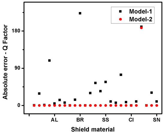 Absolute errors for Q-factor pertaining to shields of different materials.