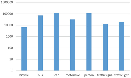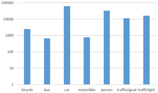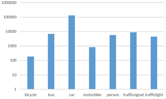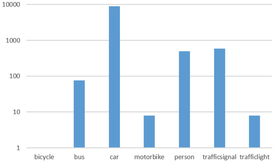 Number of annotations per class from the second set of automatic annotated images. There were 10,167 annotated objects captured with a low-resolution SONY camera with a 640 × 480 resolution. Note there is only 1 annotation for the bicycle class.