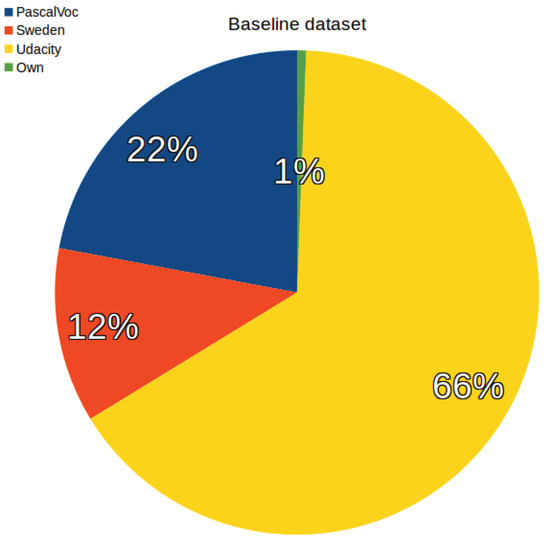 The dataset is a compendium of different publicly available datasets, such as PASCAL VOC [29] and UDacity [30], and the remaining data was acquired and annotated from real-life images. From PASCAL VOC, we took only the classes of bicycle, bus, car, motorbike and person, which encompassed 22% of the total dataset. Udacity provided 65% with the classes of bicycle, car, person and traffic light. Then, as we needed to complete the dataset with more objects, we added more images using buses and motorbikes from Internet videos, and bicycles from videos recorded in urban environments and on roads in Alicante (Spain). Finally, we added a small set of traffic lights from our own capture video that accounts for no more than 1%. See Figure 2 for the distribution of images from the different datasets, and refer to Table 1 for a later dataset distribution used during the experimentation phase. See Figure 3 for the initial class distribution.