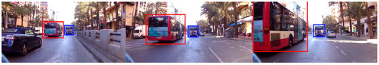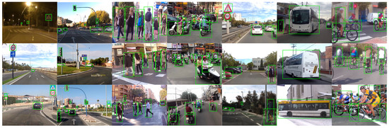 We observed that the detection accuracy for bicycles and motorbikes was not as high as for other classes, such as cars or people. Furthermore, the distribution of bicycle and motorbike objects in the dataset was also too low in comparison with the other classes. Buses were also too low, and many buses in real-life tests were not detected. So, we decided to add more of these objects (buses, bicycles and motorbikes) to the dataset, again using an auto-updated technique. We annotated 7 h of recordings (10 fps videos, recorded with the H5 camera). From those labeled images, we increased the number of buses, bicycles and motorbikes (and the other classes such as cars, people, traffic signs were also shown in the new images).
