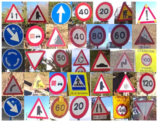 Examples of existing traffic sign datasets include the German Traffic Sign Recognition Benchmark [25] (GTSRB), which includes 43 classes and around 40,000 images. There is also the Traffic dataset from Linkoping University [26] (Sweden), which has around 4000 annotated signs and 22 classes. LISA [27] (USA) is a further traffic sign dataset with 47 classes and about 8000 images. There is also a traffic sign dataset from the University of Alcalá de Henares [28] (Spain), which has subdivided images according to their shape and color information.