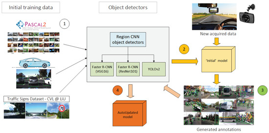 In this section, we describe all the experiments performed in this work. As a measure of accuracy, we use the mean average precision (mAP), as used in [19]. We split the dataset into 40% for training, 40% for validation and 20% for testing. Figure 8 shows an overview of the steps we followed to perform the evaluation of the baseline object detector. It also describes how we trained the ‘Initial’ and ‘AutoUpdated’ versions of the urban object detector model. In step 1, we compiled an initial dataset for urban object detection by filtering particular classes of existing datasets. In step 2, we trained a Faster R-CNN network (VGG16) using the initial version of the dataset. For step 3, using the trained model and new acquired data on real driving scenarios, we automatically annotated new images by using the initial model. In step 4, finally, we retrained the baseline network and other state-of-the-art CNN-based networks (ResNet101 & YOLOv2) using the final version of the dataset (compilation of existing datasets and new recorded data that was automatically annotated).