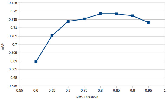 In [19], the author used a non-maximum suppression (NMS) threshold for the removal of candidate regions, setting a fixed threshold of . We tried several thresholds to select the correct one. The best NMS threshold was (see Figure 10). We trained the baseline model for 70,000 iterations, starting with a learning rate of 0.001. The results are shown in Table 1, Baseline method.