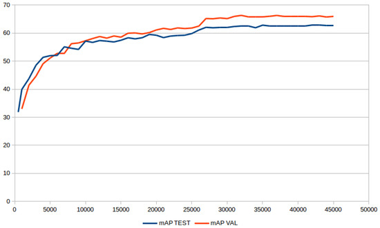 As the goal of this work is to deploy the developed system in an embedded system (like a Jetson card or FPGA), we need a fast implementation of the object detection component. Therefore, we evaluated the Darknet version of YOLOv2 [20] in our seven-class dataset. We applied a learning rate of and trained for 45,000 iterations, with a momentum of and decay of . We also achieved good results with our dataset, achieving a mAP of in the test set. After approximately the 27,000th iteration, the mAP stabilized, achieving no further increase in accuracy (see mAP evolution in Figure 11). See Table 1, YOLOv2, for results.