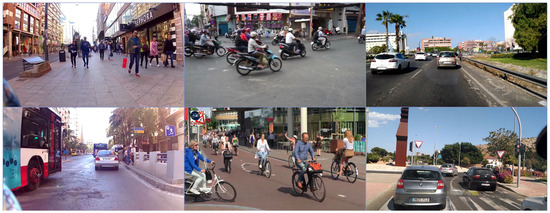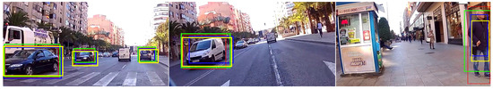 We recorded real-life videos of scenes containing many of the urban objects defined in the classes of the proposed dataset. The actual video has 8992 frames, and was mainly recorded in very busy urban environments (see Figure 12). The video does not represent a ground truth of detected objects, but it gave us information on how much better (in terms of number of detected objects) one CNN model is with respect to the others. It also provides a visual confirmation of the mAP coefficients measured earlier. After detecting all the objects in the scenes and computing various statistics for the processed video, we concluded that the auto-updated training strategy improved the accuracy when detecting objects (see Table 2). The accuracy was not greater in terms of mAP, but the number of correct bounding boxes that were predicted increased compared to previous experiments. Moreover, in some cases, the improved model was able to detect bounding boxes that were not previously detected (decreased the number of false negative detections).
