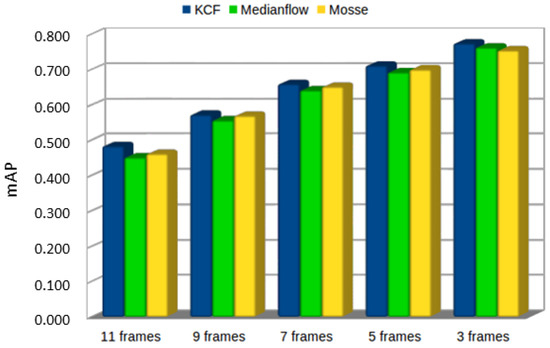 mAP for KCF, Median flow and Mosse tracking algorithms every n frames.