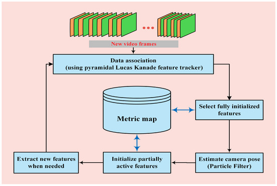 An overview of the proposed approach is illustrated in Figure 1. A data association step is performed after the arrival of each new incoming frame. In the data association step, the intention is to find matched feature points between the current and previous frames. Among all matched feature points, those already initialized are employed for the estimation of camera pose parameters in a PF framework. Once camera pose parameters are obtained, any feature point with parallax exceeding a certain threshold is initialized. Finally, the algorithm proceeds with the extraction of new features if necessary.