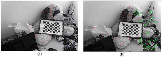 where and are the mean and covariance matrix of the camera pose in the previous frame, respectively. Let be a set of 3D points in the scene, which were added to the map in previous frames. Since the camera is freely moving in 3D space, the observed features are consistently changing. In the other words, some parts of the scene leave the camera’s field of view and hence their associated feature points should be removed from the map. On the other hand, the camera views new regions and consequently new feature points are detected. Once the detected features are tracked successfully, they can be included in the map. Therefore, Zk needs to be updated constantly. It is assumed that Uk = {u1, u2, …, un} represents the associated observed feature points in frame k obtained through the feature tracking procedure. Furthermore, according to the standard pinhole camera model with focal length (fx, fy) and camera center (cx, cy) for camera state , the projection of every 3D point on frame k is computed using Equation (5).