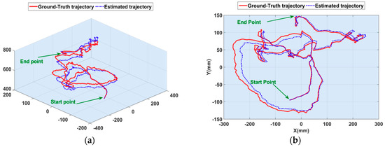 Camera trajectory estimated using PF versus ground truth data: (a) 3D view; (b) projections of estimated and ground truth trajectories on the XY plane.
