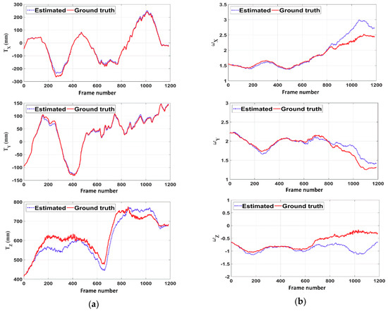 Components of estimated and ground truth camera pose: (a) Camera position part; (b) camera rotation part.