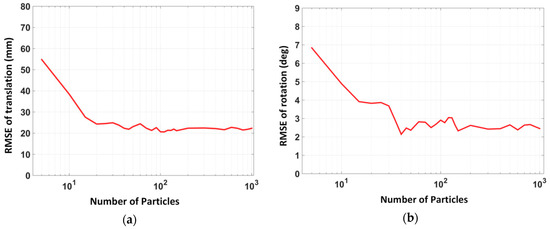 RMSE of (a) Translation part; (b) rotation part of camera pose against number of particles used in PF.
